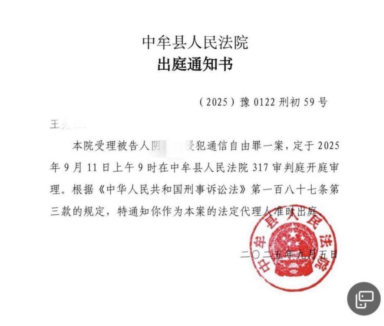 △王先生收到法院的出庭通知书。